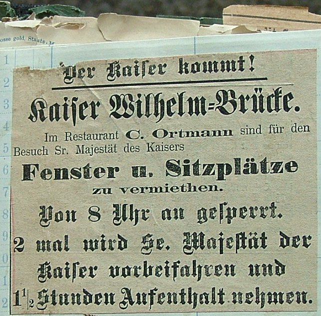Kaiser Wilhelm-Brücke. Im Restaurant C. Ortmann sind für den Besuch Sr. Majestät des Kaisers. Fenster u. Sitzplätze zu vermieten. Von 8 Uhr an gesperrt. 2 mal wird Sr. Majestät der Kaiser vorbeifahren und 1 1/2 Stunden Aufenthalt nehmen.